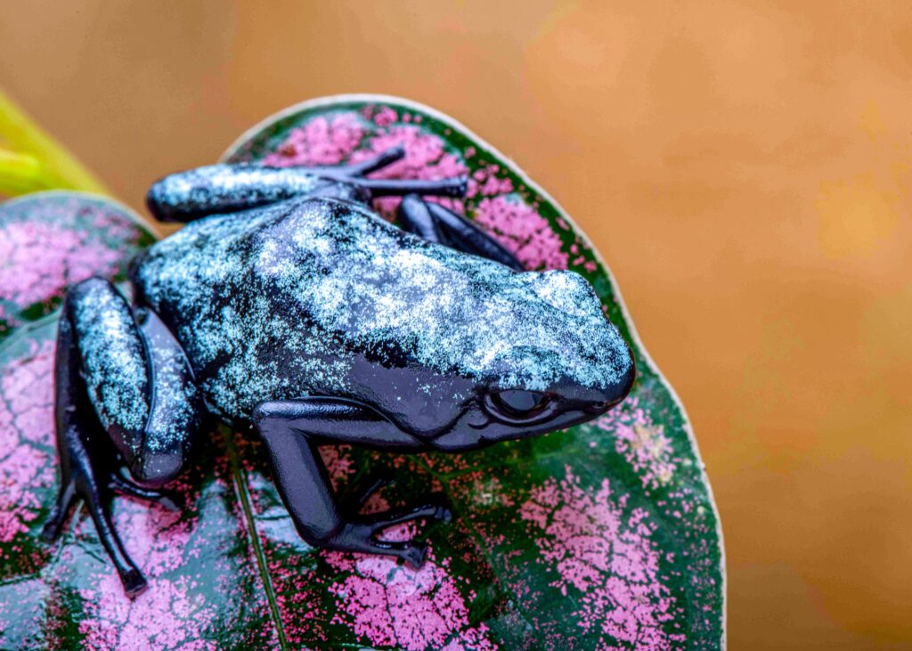 The species Adelphobates galactonotus are popular frogs in the terrarium hobby, these frogs have an unusual appearance for a dart frog, in that they are generally feature a single solid color over a black background.  The amount of the coloration is variable, but morphs generally only have a single color over the black.