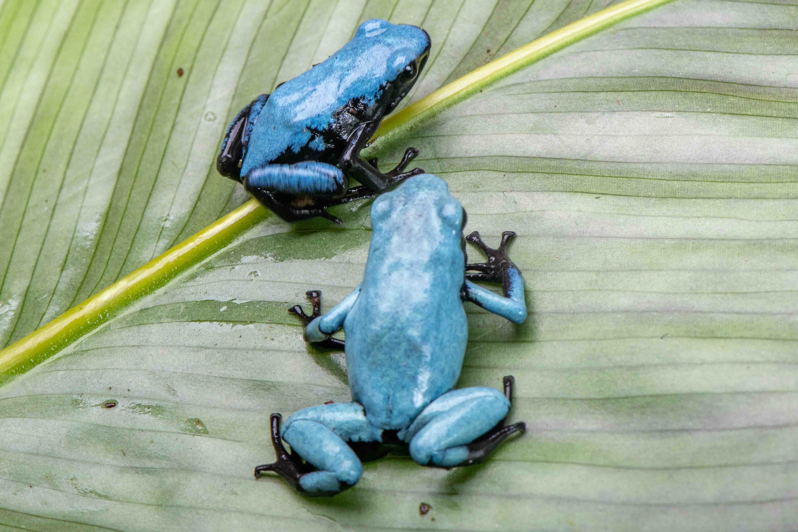 Juvenile Adelphobates galactonotus, with the “splashback” blue form on top and the “Solid Blue” form below.