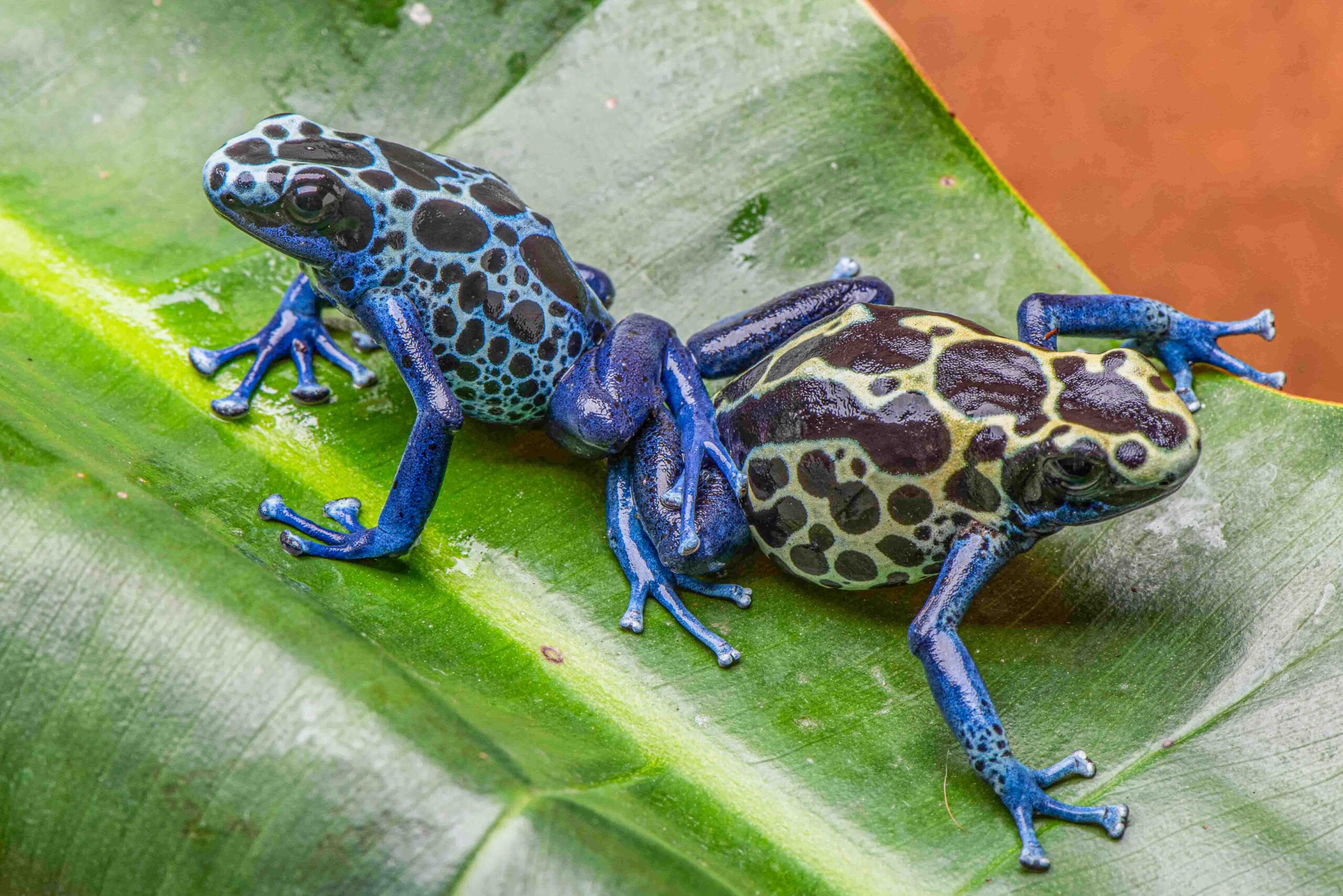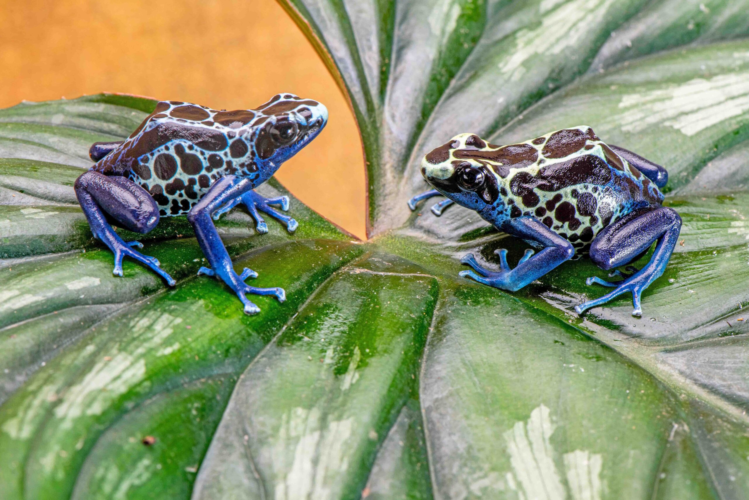 Over the years a lot of different frogs have come in to the hobby bearing the Sipaliwini label. All of them are similar in their pattern, (except, I guess, the “True Sipaliwini) but the frogs colors vary from the original Green morph, to a Yellow form that has been available here, and then these “Blue” Sipaliwini. Some of the Greens,(like my original pair) when bred, produce nothing but little carbon copies of themselves, with the full greenish yellow coloring. Others, which typically are less solid in their green coloration, having more of a netting of green, produce offspring which are somewhat variable. The Blue Sipaliwini form are highly variable, with offspring that range from yellowish, creamy, light blue and dark blue. I’ve also seen solid blue offspring produced by Green Sipaliwini that looked basically like very fine spot azureus! The last time I saw this, the poor guy that produced them told me he got thrown off a facebook group, which accused him of “hybridizing” his frogs.