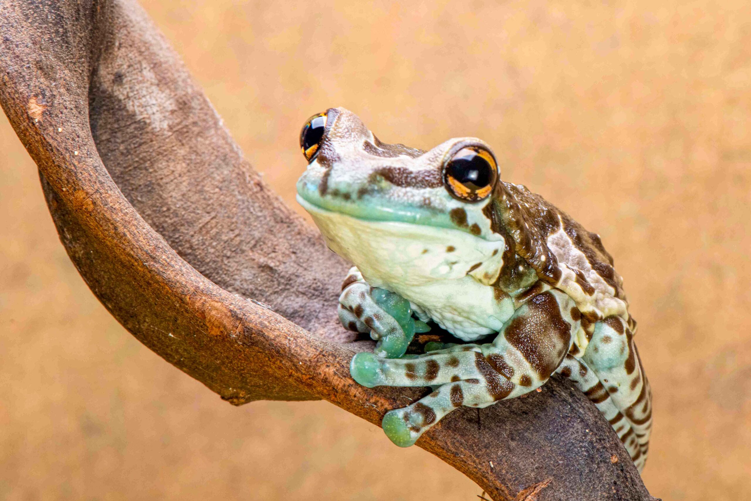 Milk Frogs have slowly become a very popular tree frog, for several good reasons! Beautiful appearance and simple care requirements are two of the main ones, plus they have what I can only think of as an engaging personality. There isn’t much that seems to bother them, they are feisty eaters, and confident movers in the terrarium. They tolerate handling well and generally can be seen in the terrarium, rarely hiding.