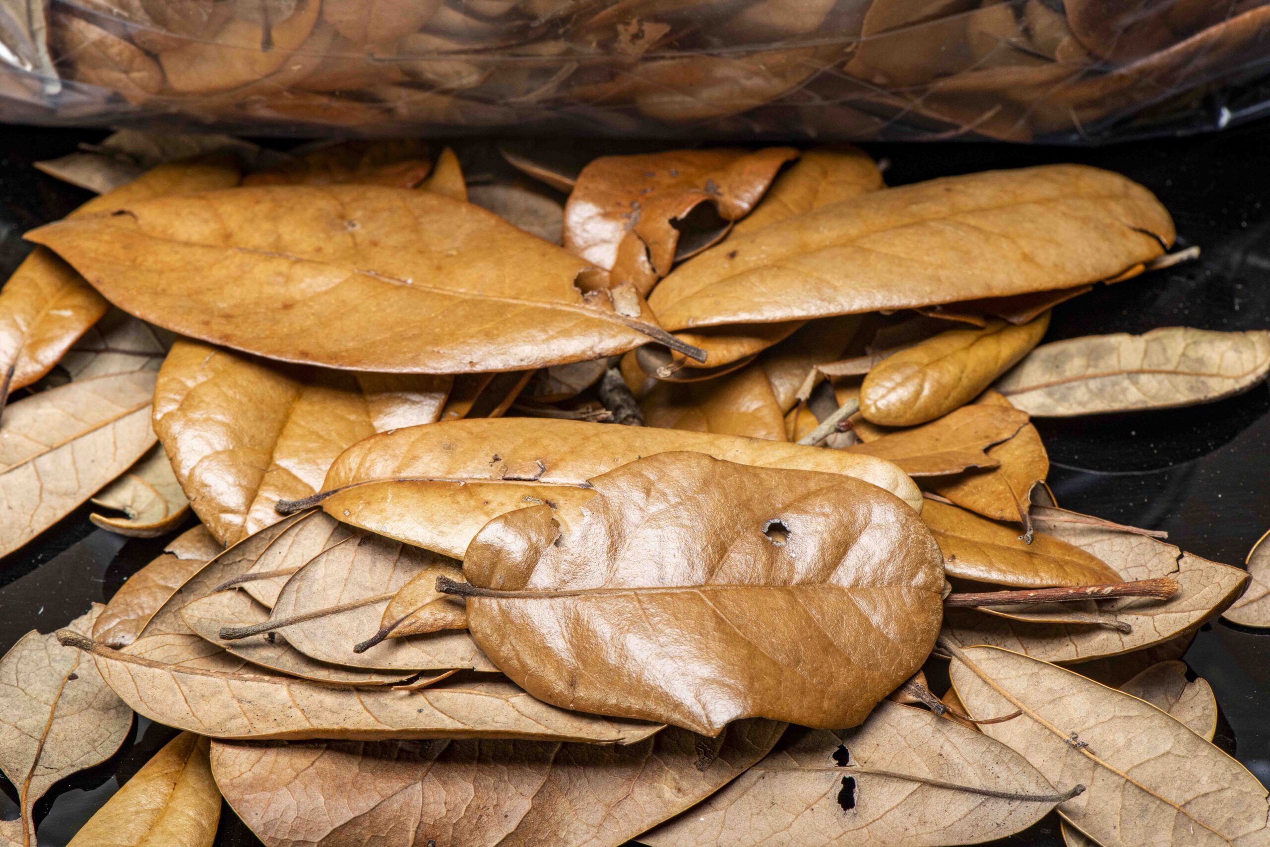 This live oak leaf litter is the best product of its kind. By that I mean, I am picky about my terrarium leaves! Over the years I’ve been sent a variety of different oak leaves masquerading as “live oak”. These “inferior” leaves are flat, and do not have the body that these leaves do. True live oak leaves are generally cup shaped (if turned upside down they hold a teaspoon of water or so) and very stiff. This stiff texture makes for a long lasting substrate, and these leaves take months to break down in even the wettest of terrariums. Some other oak leaves break down in just a few weeks.