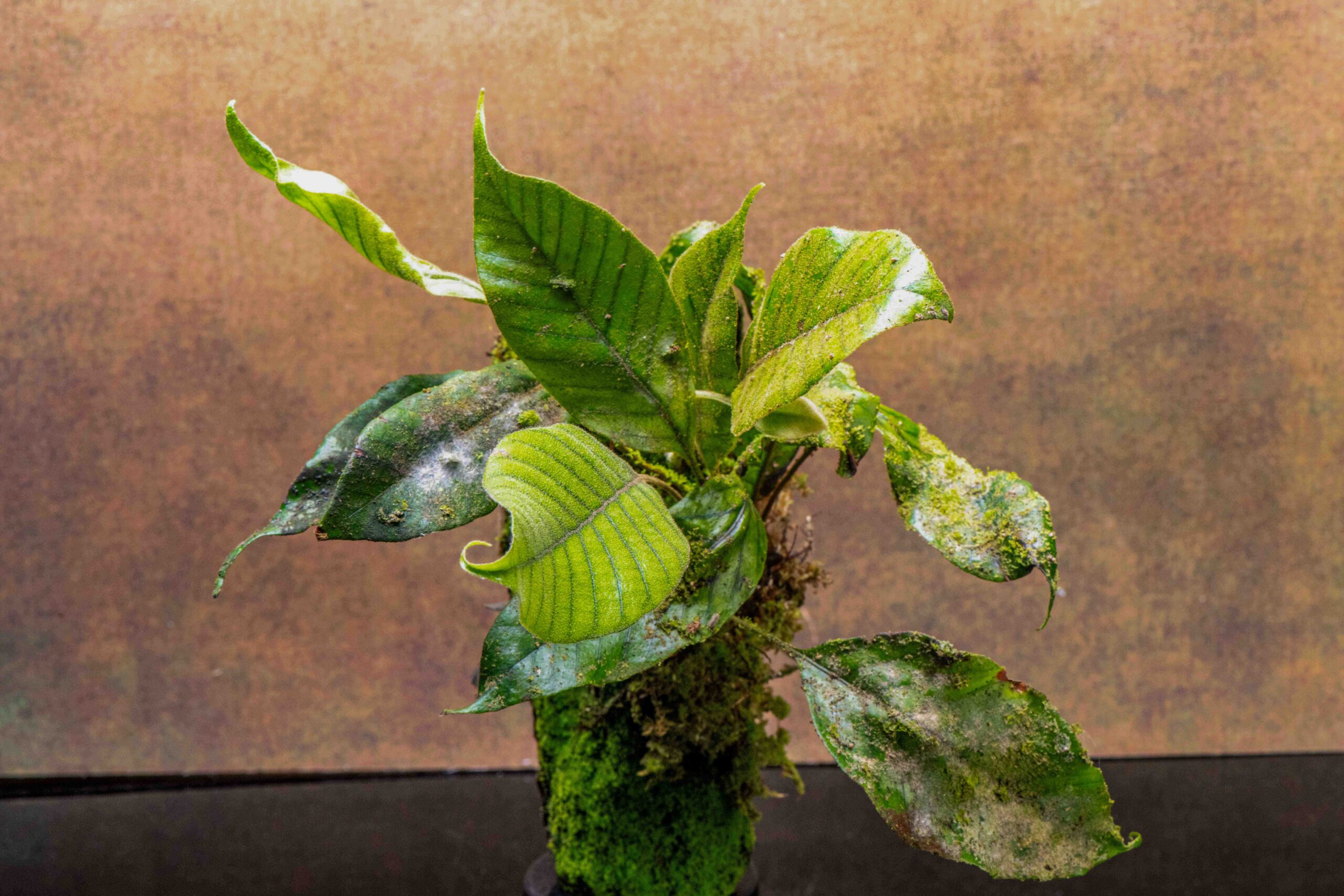 This particular specimen is mounted on a tree fern substrate—about eight inches long—and expertly moss-covered, enhancing both its aesthetic and functional qualities. The bark mount provides excellent drainage and air flow around the rhizome, mimicking its natural Epiphytic habitat while making it perfect for terrariums or mounted displays.